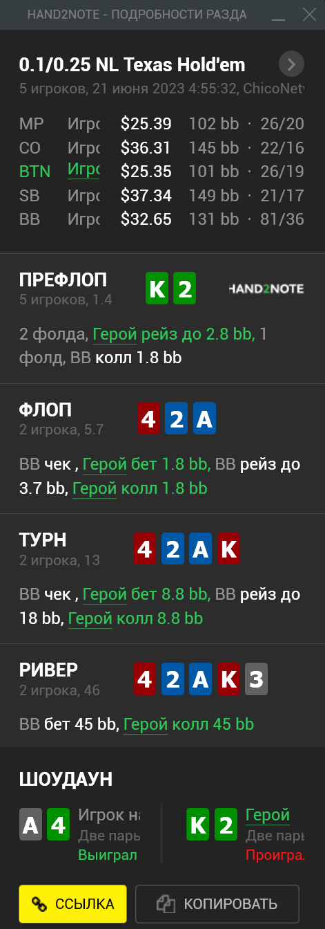 РИВЕР: ФОЛД! Одсы около 35% с учётом рейка. Возвращаемся к нашим мыслым о тёрне. Блефов было мало, да и велью слабее нашего крайне мало. Как итог у него на ривере даже если он любитель частых блефов, просто не хватит кандидатов на блеф, чтобы его диапзон на 35%+ состоял из рук слабее нашей.