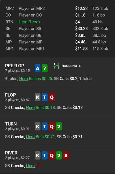 РИВЕР: ЧЕК! Блеф не имеет смысла. Всё что можно было выбить ты уже выбил. Теперь же чтобы надавить на его готовые руки надо ставить много, а если много, то и фолдов надо много. что под большим вопросом. Кроме того твоя рука всё ещё имеет небольшое ШДВ, а значит чек будет плюсовым. И чтобы твой блеф за условные 3/4 был плюсовее плюсового чека, тебе надо получить свыше 50% фолдов от оппонента. И так часто я не думаю что некий фишной оппонент способен выкинуть на ривере. Ну а если лупить более крупные сайзы, то фолдов надо ещё больше. На овербет 150% надо будет получить около 70% фолдов с учётом того что чек плюсовый.