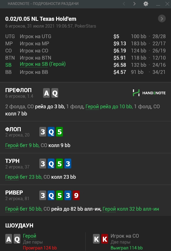 И наконец ривер, по такому развитию борда остается только пуш, очень мало вероятно что у соперника будет Q9, а если он коллирует мастевые Q9 на префлопе, то это всего 1 комбинация , 33 (1 комбо) и 55 (3 комбо), если он с ними коллировал на префлопе и слоуплеил далее, сделай мы 3 бет 12бб, 33 хотя бы можно было уже исключить, как и Q9. В любом случае мы не сможем тут сыграть чек/фолд и если будем чекать, то придется коллировать, а раз у нас нет информации об агрессивности нашего оппонента, лучше запушить самому и за счет ФЭ+эквити пуш будет однозначно прибыльным. И да при СПР в еденицу, нужно пушить, а не оставлять огрызок стека, иначе с руками хуже когда он будет делать колл, ты не доберешь, а когда он впушит, ты ему оплатишь.
