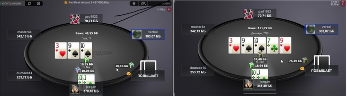 РИВЕР: ЧЕК! Твой блокбет не несёт в себе смысловой нагрузки. Связано это с тем, что фиши крайне пассивные на ривере. Поэтому ты пытаешься заблокировать его блефы, которых не будет просто-напросто, по причине отсутствия у него такого желания. А вот рук сильнее твоей там хватает. Так же блокбет плохо работает в очень агрессивных оппонентов, так как они активно его рейзят и надо сбалансированно против них ставить блокбеты, иначе это заливбеты будут, есил ты будешь ставить их с планом фолда.