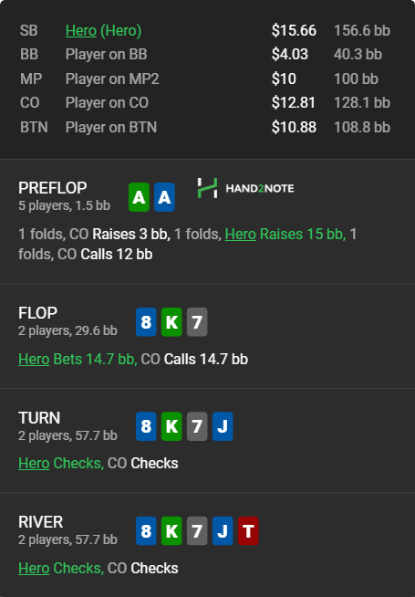 ТЁРН: Вот тут чек крайне страшно видеть. Наша рука имела гарантированный прямой вельюбет. Сайзинг стоило использовать в районе 2/3! Да, там есть руки сильнее, но рук слабее, которые нам ответят, - там больше.