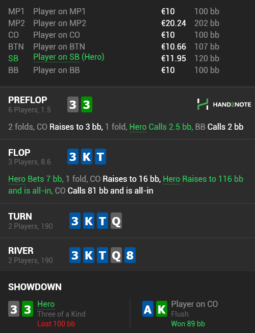 Сейчас посмотрел что там далеко не все АК , есть и натсовые флаши / средние флаши / сеты лучше и то сеты так играть не будут минрейзом. Как лучше было сыграть с флопа? Колл рейза / колл терна и фолд ривер по такому ранауту?