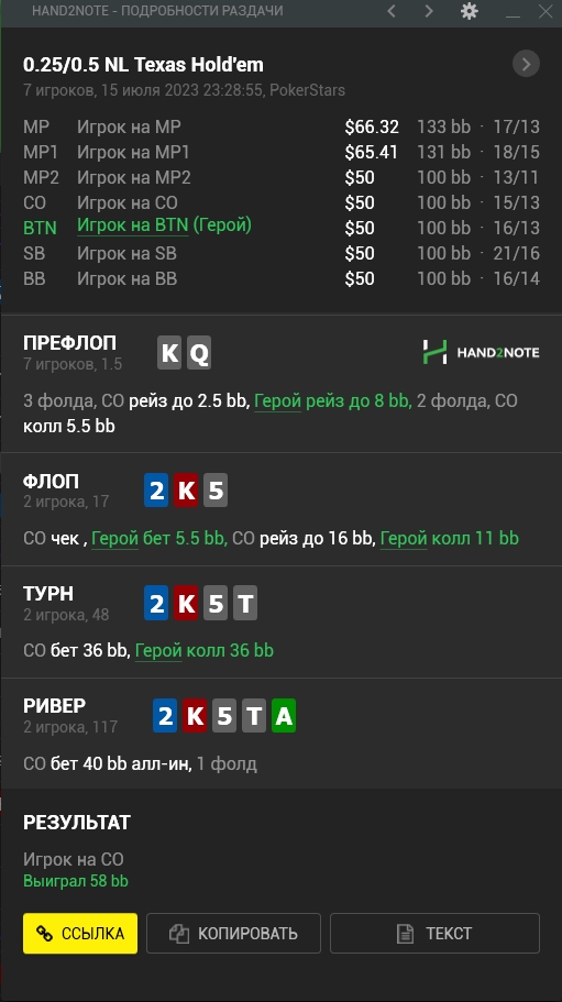 РИВЕР: Хороший, но запоздалый фолд! Наша рука бита в щепки и несмотря на казалось бы мелкий сайзинг, надо фолдить, так как это уже мусорная рука.