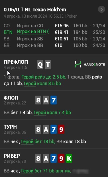 После того как оппонент сделал чек-терн возникли сложности с принятием решения. Терн добавил аутов к нашей руке, и я не хочу получить чек-рейз. Какой размер ставки будет оптимальным в этой ситуации? И стоит ли вообще делать ставку?