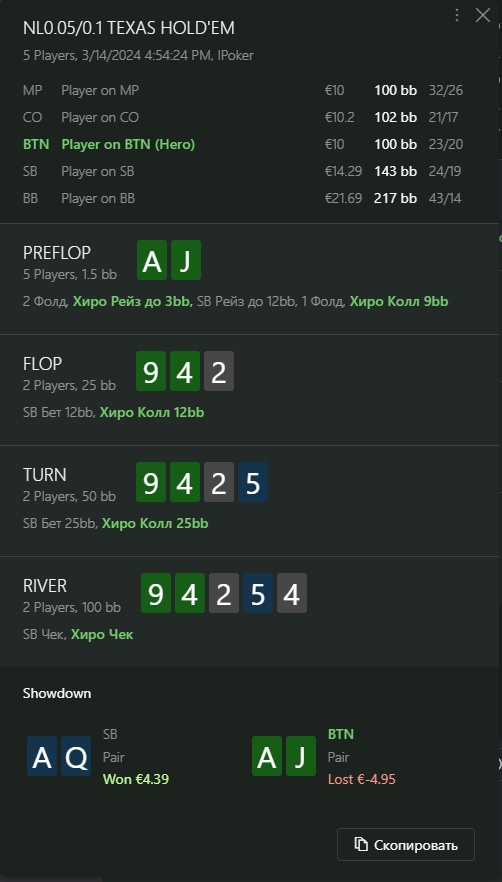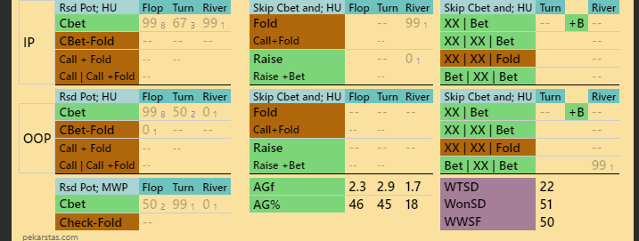 Опп ТАГ, агрессивный 2 улицы, ривер пассивный, как стоило сыграть? ривер Флоатим пушем? но из готовых мало что упадет, так же блочим диапазон блефа. 1.4к рук на оппанента