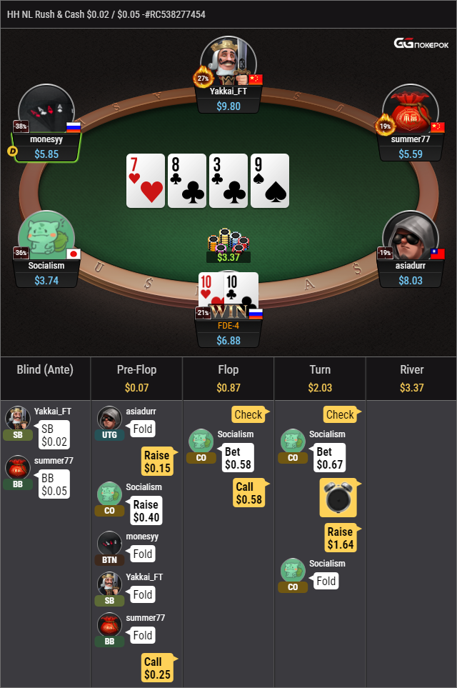 Тёрн мы усиливаемся и опп ставит треть. С одной стороны ставка может показатсья странной и не похожей на велью, но с другой стороны для оверпар оппонента вышли очень плохие карты и возможно он таким образом пытается потконтролить, либо блокбетит своё среднее шдв. Ни в первом. ни во втором случае мы не хотим вкладывать лишние деньги в банк, а хотим подешевле купить свои ауты или дойти до шд. А значит тёрн продолжал бы играть коллом с плаом фолдить ривер без усиления