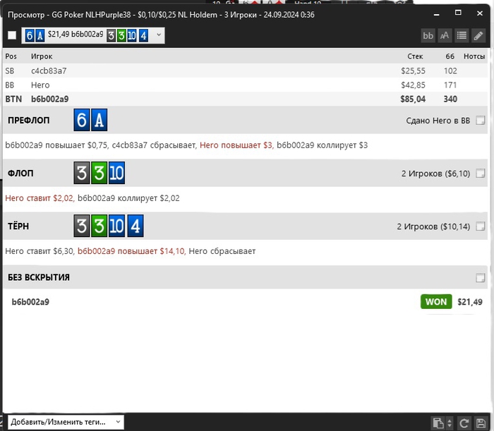 Стол развалился, осталось 3 игрока. Оппонент хобби игрок, выборка 80 рук, vpip 29/16, WWSF 48, WonShowDown 64, агр по улицам 22\29\23, но т.к. выборка очень маленькая, я бы на нее особо не ориентировался.