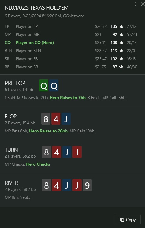 Тёрн. Мне нравится сыграть терн просто толкнуть. Там далеко не всегда будут валеты. часть валетов сыграет от чек колл линии флопа, часть валетов выставиться через донк пуш, наши дамы блокируют часть валетов. В общем с учётом всего этого, я бы сильно не боялся второго валета. По такой линии вполне могли сыграть карманные девядки, десятки, A8s.