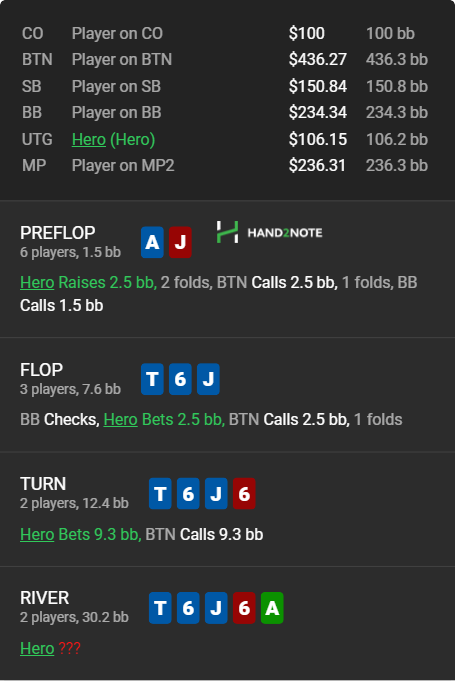 Вбил во флопзиллу. Получил что на ривере у него примерно 60 комб сильнее нашей. Флаш, стрейт, шестерка. Думаю наврядли мы наберем столько комб с валетом и руками хуже для колла.)