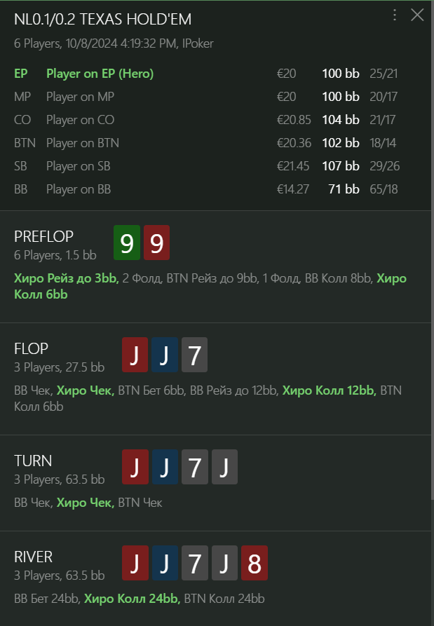 Префлоп 3-бет, ну ок. Хотя с ЕР можно и сфолдить, наверно. Ну или открыть за 2бб, например, попробовать половить сет на флопе задёшево в надежде потом выиграть много у фиша. Получил 3-бет от нитового BTN. Не колл, а 3-бет! От нита! Да он буквально кричит этим, что хочет на стек сыграть. Против такого без позиции я бы не то что