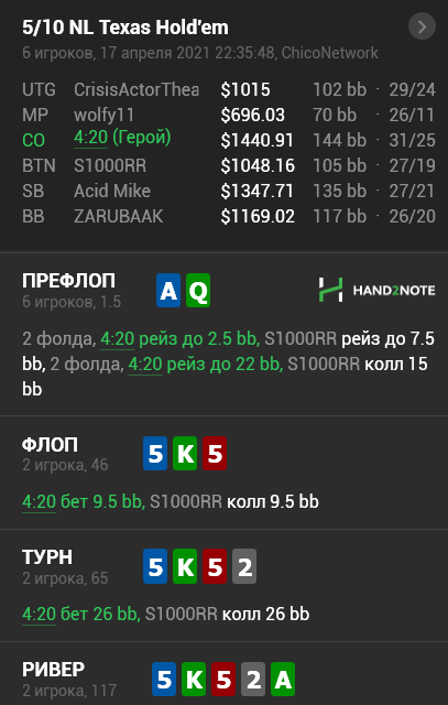 Тёрн - двойка абсолютный бланк, лучшие блефы продолжаем, худшие чек фолдим, из велью уходим в чек с фулом, слабые Кх, и чуть посплитить АК