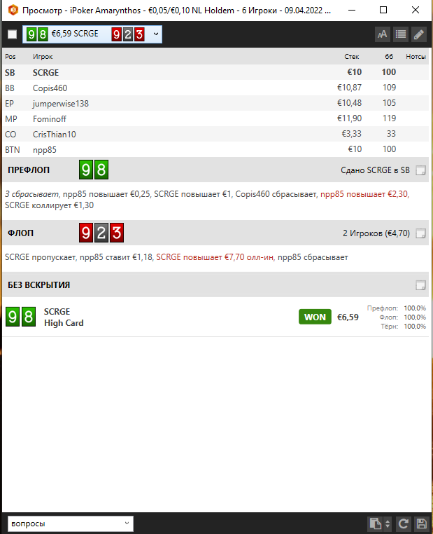 Теперь разберем постфлоп, которого уже не должно было быть, но всё же: