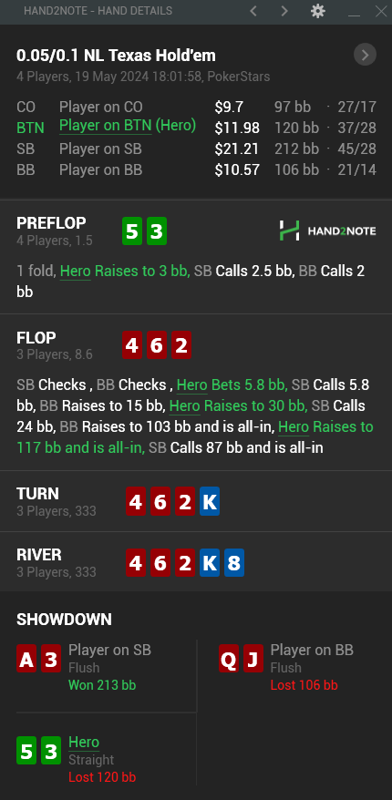На рейз просто колил бы и играл дальше очень осторожно, на вменяемые сайзинги по терну скорей всего выкидывал бы. Играть ререйз на флопе это дикий оверплеи, у противника куча флешей в рендже.