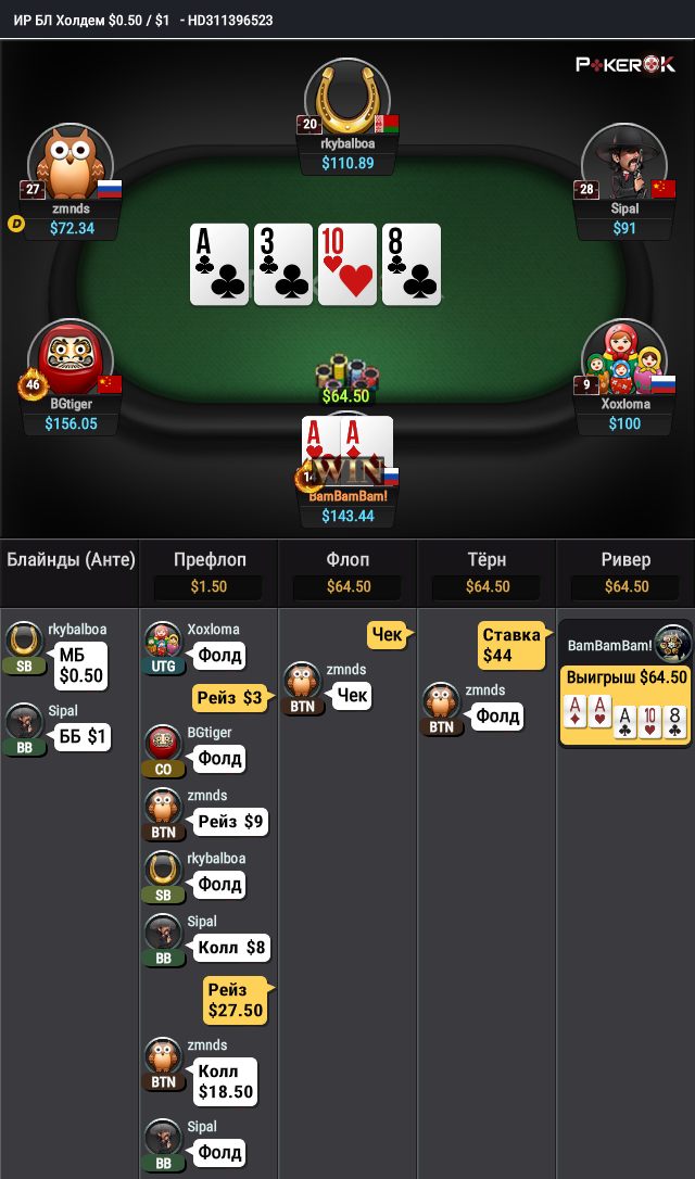 Эфф стеки то понятны, но это все равно занимает время, чтобы их прикинуть, про BU согласен - сам не сразу понял, где он. Про пот бет я писал не конкретно по этой раздаче, а то, что именно при таком СПР на терне никогда не будет ставки ни 1/2 пота, ни тем более 2/3.