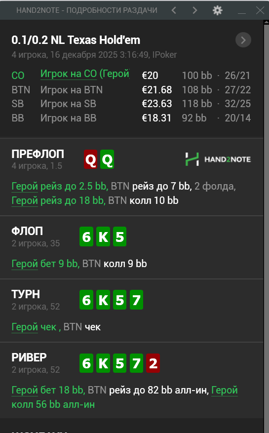 Идеальный (максEV) сценарий с QQ по факту, а не в мечтах - дать 4бет и отобрать эти "жалкие" 7-9-12 бб, хотя это "аж" третья стартовая рука по сырому эквити. Если враг толкает - изи-колл во втором по EV сценарии.