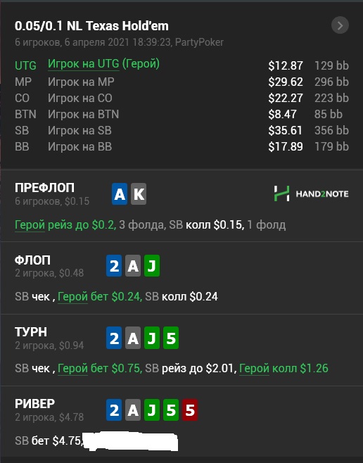 Флоп играл бы от чека; как сыграно - на ривере блочим часть флашей, часть стритов через АД (к тому же часть стритов и фд могут не играть через блокбет терна, а выбрать другую линию). Часть стритов блочится доской.