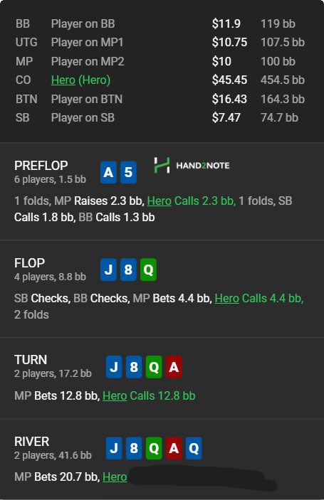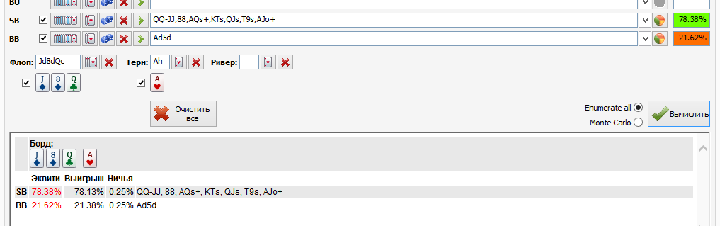 Там особо добирать не с чего. Если смотреть по флопзиле там из флэшей только KT. Доперы превратились в фулы и он не капнут на верхушку QQ, AA, JJ, 88. у твоей руки 37% против его адекватного ренжа. Велью рейза нет.