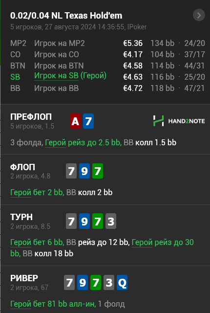 Я никогда, в прямых линиях, при оценке баз данных, не видел у фишей оверфолдов. А если предположить, что нас будут вскрывать только 7х и лучше, то это фолд порядка 80% на ривере, не слишком уж много? И даже тогда, это легкий велью пуш.