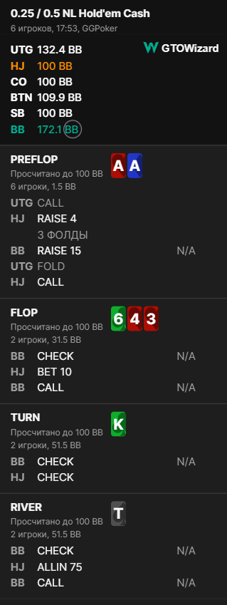 По флопу: так стоит тут защищать чек или все же от широкого CB? Это структура никому не подходит, т.к. сеты у оппа будут крайне редко, а значит как были впереди по эквити на префлопе, так и остались из-за большего количества оверпар. При таких вводных действительно часто стоит играть от широкого CB. Сайзинг: использовать нужно сплит сайзигов и тут это будут 1/4 и 3/4. Конкретно с АА 1/4 будет куда лучше.