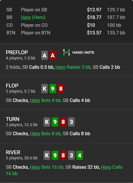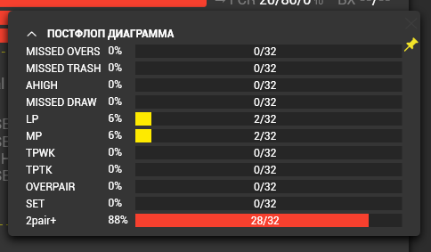 На оппонента в момент раздачи было 78 рук в ХМ, статы 52/9, агрофактор 0,9. Предположительно пассивно-телефонистого типа, каких-то неадекватных агро-мувов не делал. В Статнейме на него инфы не было.