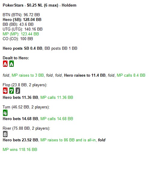 Флоп 1/3, терн в агрессивного можно уйти в два чек-колла, тк твоя рука неуязвимая. Бет тоже не ошибка, но если бетать, то обяз 3/4 и пуш ривер, тк QQ уйдут редко, а тебя еще иногда примут по AJ. По тому, как сыграно, я бы там не оказался, но первая мысль в том, что ты не сильно походишь на натс, тк ты бы юзал бОльшие сайзы, но ты также и не похоже на блеф (основная прична, почему линия плохая). И по дефолту я бы зарыл, тк я не ожидаю там оверплея/блефа и положил бы его на JJ исключительно, тк остальные оверпары по той же логике рейзят раньше.
