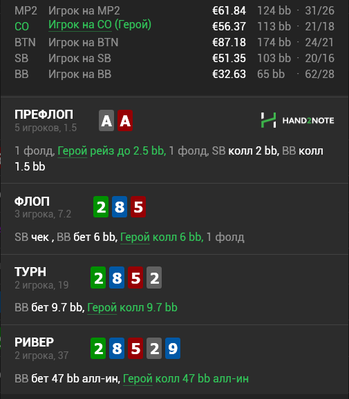 Колл на флопе тоже имеет место, опять же на турне можно пытаться выставиться самому, т.к. 2х там будет не так много, но при этом оверпары, которые там точно есть, тп и дро любитель редко выбросит.