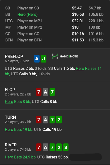 Засквизил АJ чтобы изолировать фиша (62/15) на Utg. Как лучше было разыграть руку на такой доске: флоп 1/2, терн 2/3+ и пуш в любой ривер чтобы макс-но добрать с Ах слабее? По тому как сыграно, есть ли колл на ривере?