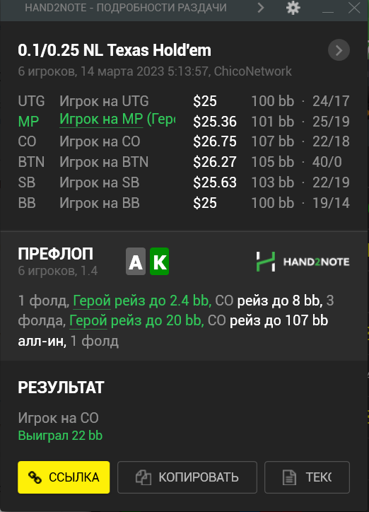 Теперь к вопросу нужно ли 4бетить, или просто колл 3бета. Повторюсь, конкретно этот опп никогда почти не играет коллом 4бета, на пуш мы фолдим, поэтому получается, что АКо это блеф 4бет. Вроде бы слишком хорошая рука, чтобы ее просто в блеф 4бет превращать, поэтому можно просто коллировать, так как рука имеет эквити на колл с запасом, но тут нужно уметь играть 3бет поты без позы и инициативы достаточно хорошо, чтобы не растерять этот запас. Если чувствуешь неуверенность в этом плане, то 4бет-фолд будет не ошибка. Если же оппонент имеет рейнж колла 4бета, то тогда АКо точно в 4бет отправлять.