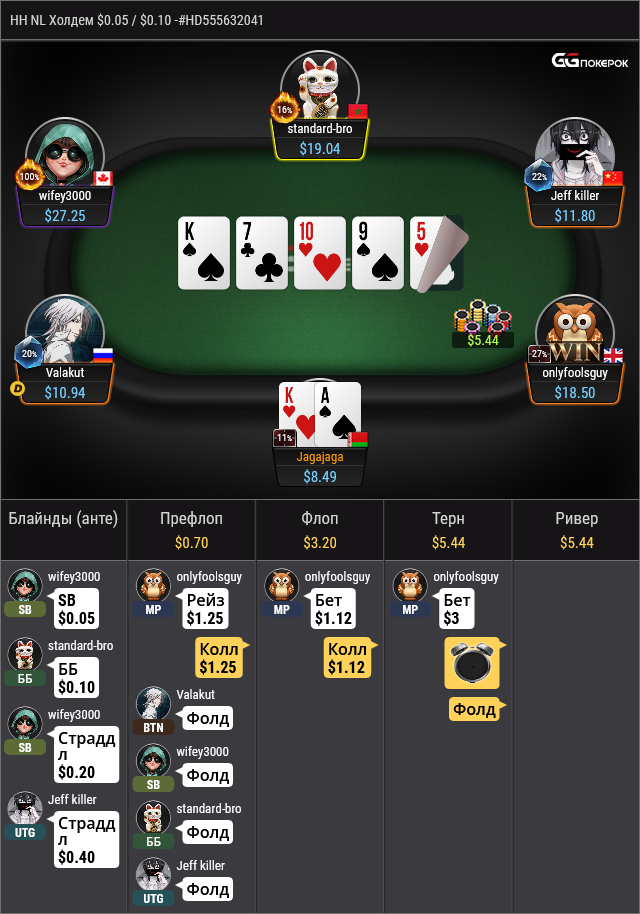 Колл тоже около дела, но тогда тёрн мы тоже должны колоть, т.к. тут не сложно придумать руки для второго барреля в блеф и решать уже на ривере колоть или нет, но скорее нет