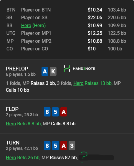 Стандартный спот, АК, 3-бет пот, ТПТК. Летит пуш во второй баррель. Следует ли тут делать хиро-фолд против такого оппонента? Фолды на префлопе-флопе низкие, терн-ривер пассивен, но почему-то WonSD низковат...