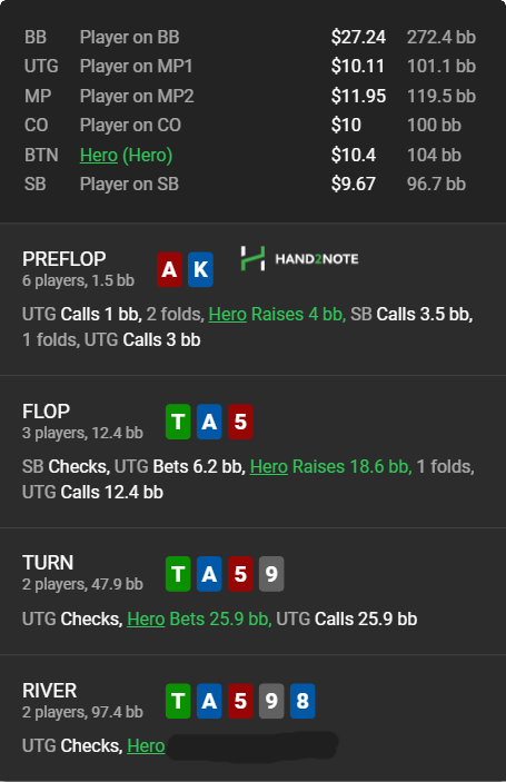 Для ТПТК пот в 97,4бб это максимум, больше лучше не разгонять без хорошей предыстории игры с ним