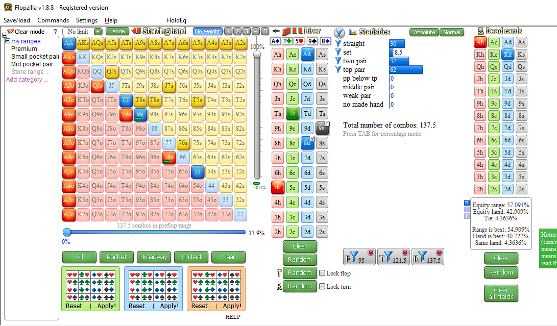 Мне больше нравится увеличивать сайз на всех улицах. Префлоп изолейт 6бб+ (такие котируют и больше). Флоп рейз тоже крупнее и на терне овербет пуш, туза он вряд ли выкинет. По твоей линии добор на ривере есть, остаётся куча тузов слабее и я бы пушил. Допер он мог порейзить уже на терне, по сути боимся А8 только.