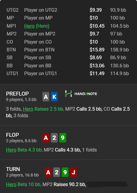 Ну вот кто из нормальных людей сделает ре-рейз х9 на таком тёрне? Никто, поэтому гадать тут можно сколько угодно. Здесь главное - готов ли хиро играть на стек с 1 парой? Я бы не стал: в его колд-колле на префлопе есть масса всевозможных J9, например. Получил J9, испугался, что ривером придёт черва или картинка, вот и "защищает" свои доперы. Или там вообще так испугался сет двоек/девяток. Или А9, или ещё что. В общем, проверять с 1 парой я бы это не стал