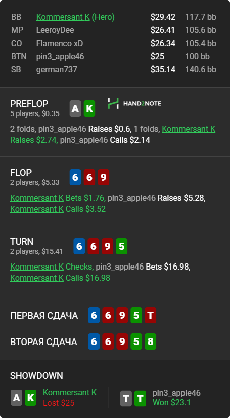 Как тут лучше сыграть? На флопе точно выкидывать не стоит, но и пушить такую руку на его рейз мне не очень нравится, в лучшем случае поедем против фд, против остальных рук у нас очень мало эквити. На терне тоже не понятно как стоит сыграть, короче не смог выкинуть.