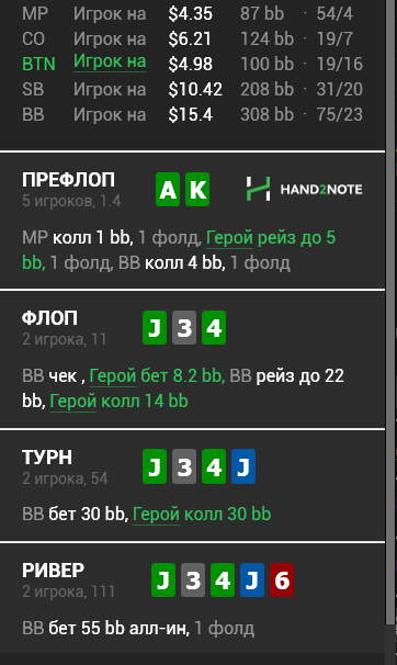 Но повторюсь, что чек тут будет наиболее плюсовым вариантом игры, так как у нас отличная рука для ловли блефов и заработка с них, а кроме того доехав во флеш, мы всегда сможем отпушиться к риверу, так как будем в позиции.