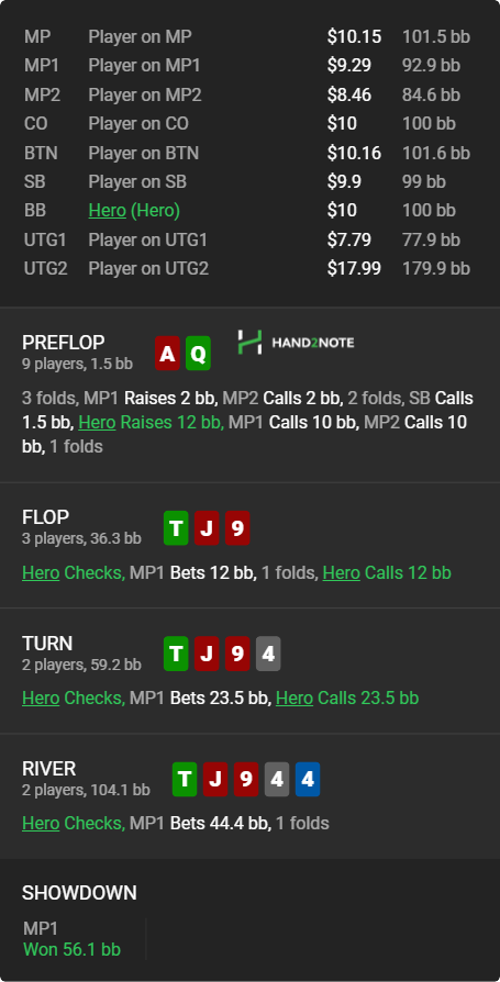 Выпала стремная доска, я пропускаю Ц-бет в 2-их, опп на МП (тайтово-пассивный 23/3/1) ставит треть на флопе и терне, вроде как по шансам для колла. Мне ничего не доехало и на ривере скинул.