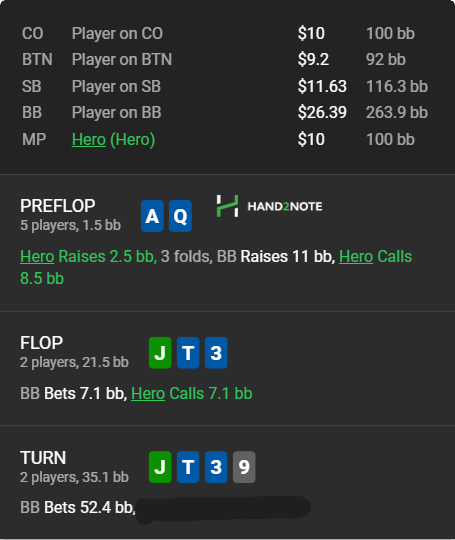 Оппонент обычный регуляр, 3 бет с ББ против МП ~ 5%. Руку AQs защищаю коллом. На терне хиро поставили в неудобное положение, поставив размер ставки, который создает шансы банка примерно равный эквити руки хиро... Как лучше продолжать на терне?