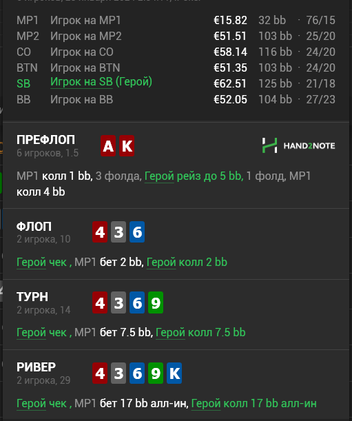 На противника было 32 руки. Статы 72/15 или около того. Агрессия под 60 на всех улицах. Во время раздачи видел что на флопе у него донк был под 80 (случаев было в районе 10).