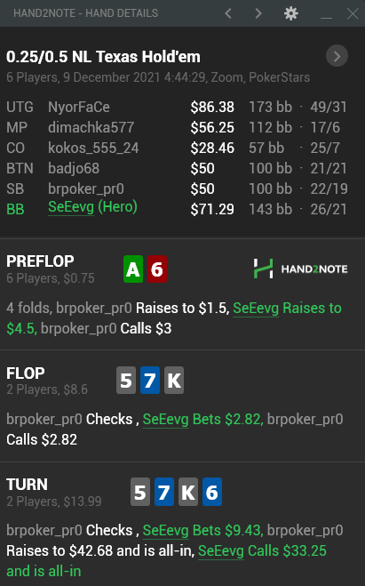 Оппонент нам даёт отведать пушца на наш бет и это должен был быть пас от нас со скоростью света. Но Хиро делает сильно минусовой похер кол при одсах 33% имея 15% эквити, да пусть даже если вдруг 20% или даже 25% кто-то нарисует. Но кол плюсовым от этого не станет.