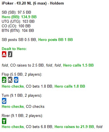 В теории, конечно AJ имеет какое-то ШДВ и с ним можно чекать, но против агрессивного соперника, вероятность, что он станет чекать ривер с А7 или А8 и отдавать банк, очень мала. Поэтому, если план играть чек/фолд, то лучше всегда поставить самому. Ставка в такой ситуации, будет приносить автоматическую прибыль, это один из самых овер фолд сценариев на низких лимитах и в чем прав Ebony_Maw, когда мы планируем выбивать не Ах и воздух, а готовые руки, сайзинг лучше выбирать побольше, небольшой овербет, был бы самое то, где то 11-12bb.