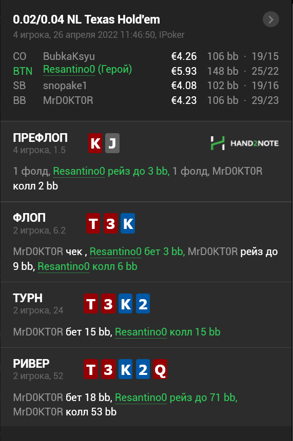 ТЁРН: Нормальный колл, но уже дело попахивает жареным. Играем аккуратно ривер.