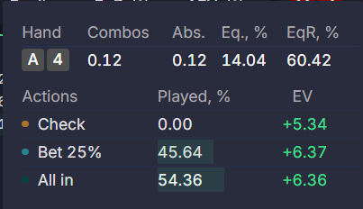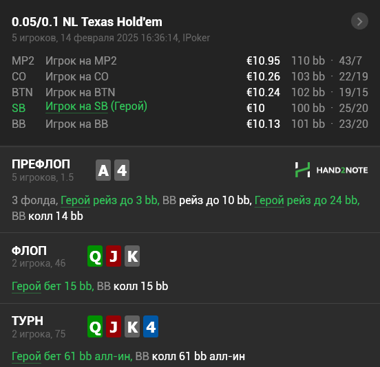 Префлоп думаю стандарт, флоп можем ставить весь диапазон, у нас будет натсовое преимущество и в целом большое преимущество по диапазону и будет не просто сбалансировать весь велью диапазон. Соперник решает сыграть колл и на терне мы попадаем в пару 4, что нам делать дальше?
