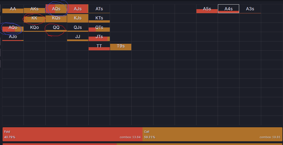 Нам не нужно выбивать две пары и лучше, нам не нужно выбивать АК и АА, все что нам нужно, это 40% ФЭ, что бы пуш был лучше чек/фолда (скрин 1), а теперь смотрим с какими руками солвер отбивает пуш на терне (скрин 2). Синим отмеченны руки, которые он должен часто коллить, но не будет (если он не конченный телефон), а красным, руки, которые он должен коллить, но которых у него не будет часто с префлопа. 1+1 = оверфолд.