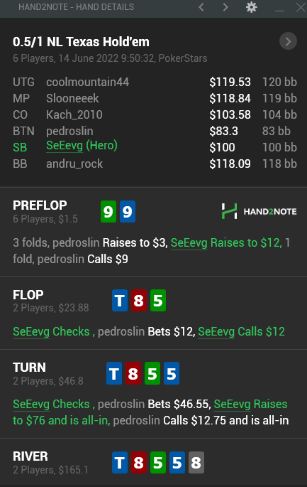 Точно бет флопа, доска испортится всегда для твоих 99. Ставил бы 40%, чтобы рейзы реже получить, тёрн чек-колл всегда, а ривер колл только на небольшой сайз в норм ранауты. Ты кмк сыграл дорогой и ненужный космос. Я бы просто тёрн рыл на такой сайз, тк по дефолту потбет даже от агрича это сила, а это эффективно аллын в этом споте, у тебя просто оддсов не наберётся на колл/пуш без инфы.