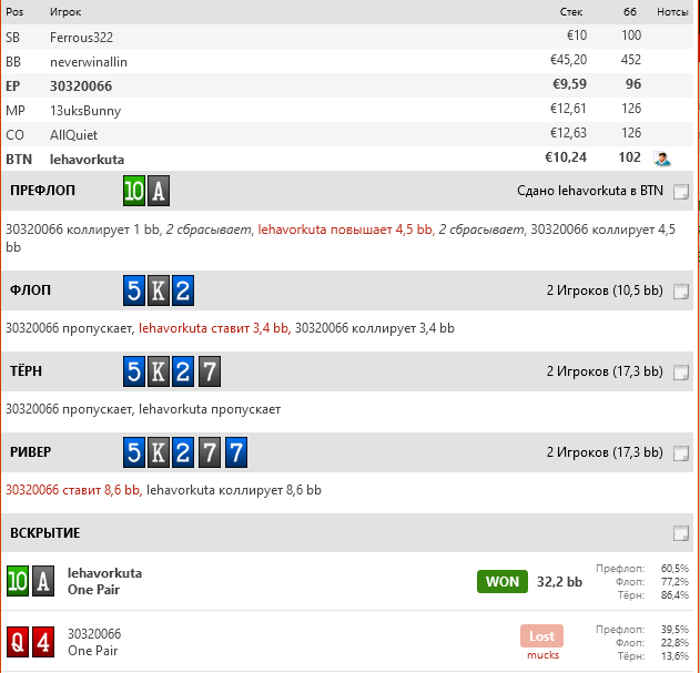 Оппонент-любитель. На флопе ставлю 1/3 всем диапазоном. На тёрне не вижу смысла продолжать, у руки есть некоторое ШДВ. На Ривере в таком сайзинге у любителя, считаю, может быть что угодно и блефов хватит на колл. Ваше мнение?