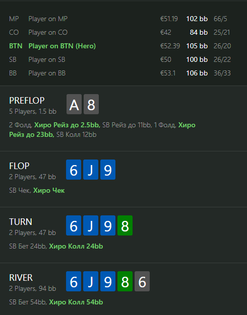 Не уверен что после большой ставки по тёрну оппонент захочет часто доблефовывать в таком крупном банке. А если отталкиваться от нашего диапазона, то конкретная рука находится в нижней его части, что тоже дополнительный аргумент за фолд
