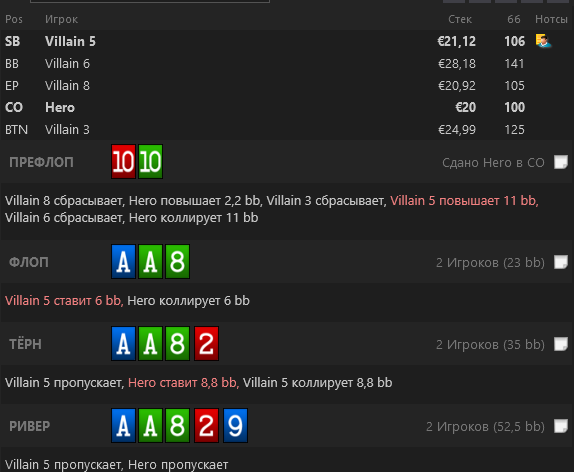 Тёрн: Рука средней силы, но уязвимая и стоящая впереди немалой части спектра оппонента. У него немало дров: ФД, Kx и Qx + рандомные карманки или K8s (захотел он так). Выгоднее с них добрать сейчас со своим ренджом, который тоже содержит немало пробивонов в (полу-)блеф и получить колл одной и единственной улицы. В районе 50% банка в вакууме. А как она будет воспринята - вне моего контроля.