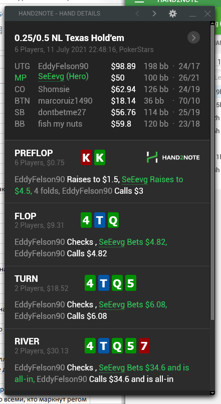 Если враг видит нас как агрессивного регуляра,он конечно может слоуплеить какие-то флаши, но мы их частично блочим ,к тому же реги с ввсф 42 на такое редко способны . Диап врага состоит как мне кажется : Флаш по АТ (если он там есть еще) ,сет QQ ,(сет ТТ не закладывал бы так как борд динамичный и скорее всего их враг порейзит), ТП и кармашки с картой в масть.Так-как доход у оппонента высокий , полагаю он будет широко отбивать с учетом имиджа хиро и мисснутых дро.Изи пуш на вэлью