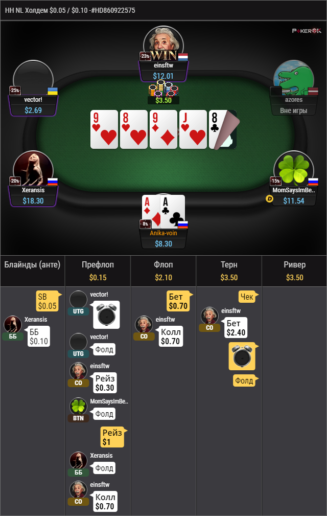 Флоп: Стандартный контбет. Сайзинг лучше использовать более крупный, доска достаточно дровяная, трипсов и фуллов у противника не так много. 50% думаю было бы хорошо.
