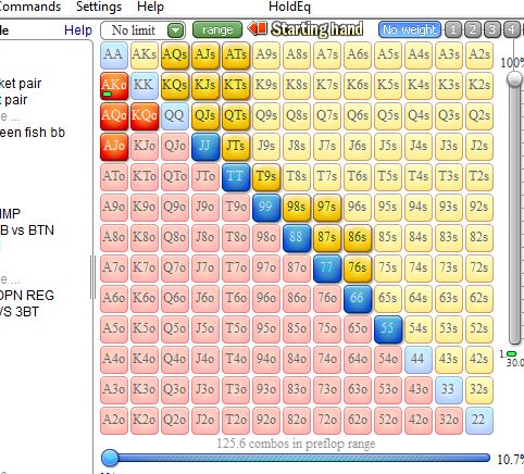 вот его рендж по терну JJ-55,AQo-AJo,KQo,AQs-ATs,KQs-KTs,QJs-QTs,JTs,T9s,98s-97s,87s-86s,76s,[30]AKo[/30]